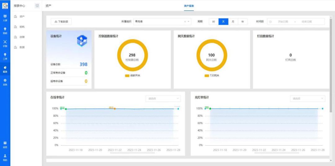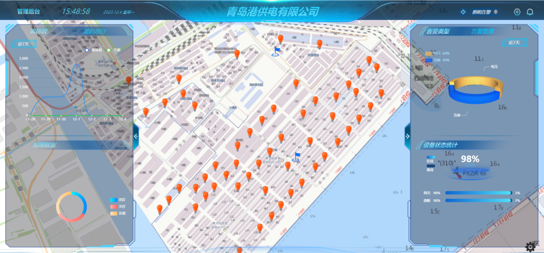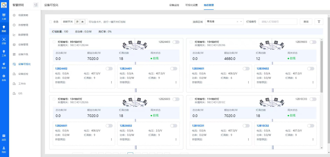 該項目基于港區內需要維護的照明設施點多面廣分布特點,將人機操作、遠程控制、終端響應等環節相結合,在每個變電站搭建集控中心,采用智能化無線控制技術,對照明設備進行遠距離智能控制,從而實現對燈具的遠程控制、分組控制、故障報警、壽命監測、故障預判、按需亮燈、數據采集、報表分析等多種功能,確保隨時掌握管轄范圍內照明設施運行狀態的效果。